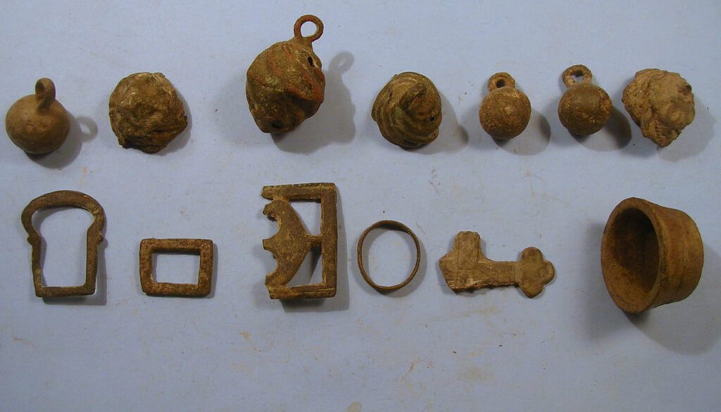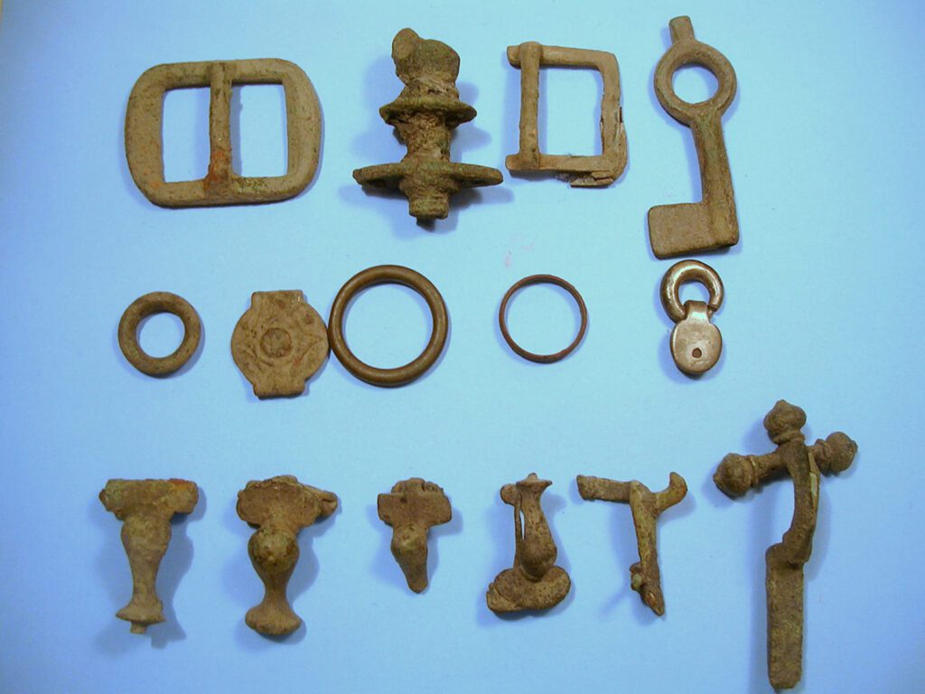 Bronz (réz) gombok, függők, övcsatok, gyűrű, Krisztus-kereszt, súly a Keréktó-dűlőből (a szőlőkből)