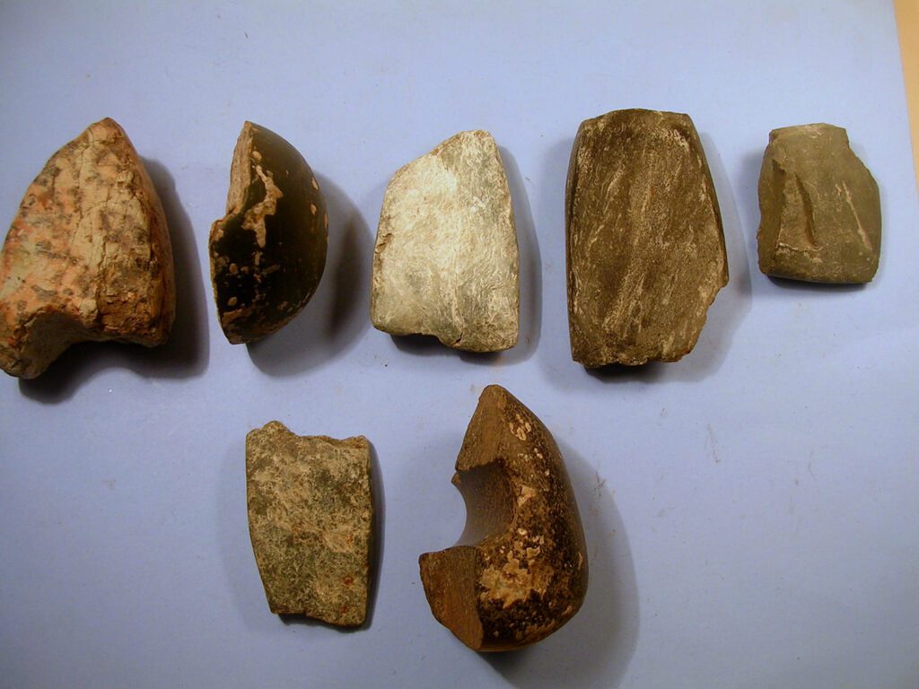 Csiszolt és átfúrt kőszerszámok a Kelemente-patak mellékéről