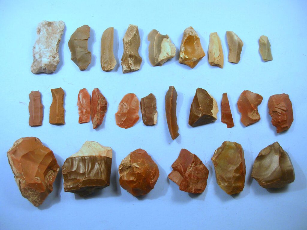 A Kelemente-patak melletti lelőhelyen a pattintott kőszerszámok (pengék, kaparók, fúróhegyek) zöme a nagyon kemény, jól hasítható, többnyire vörös színű radiolarit ásványból készült, amelyet nagy valószínűséggel a Bakony hegységben lévő, szentgáli Tűzköveshegyen található bányából importálták. (A népnyelv tűzkőnek nevezi, mivel előszeretettel használták szikracsiholásra is.) De előfordultak kőszerszámok másfajta alapanyagból (például kvarcitokból) is. A pengék mellett sok pattintékot (megmunkálási hulladékot) is kimosott az eső, de előkerültek a szántásokban szép magkövek (az alapanyagok) is.