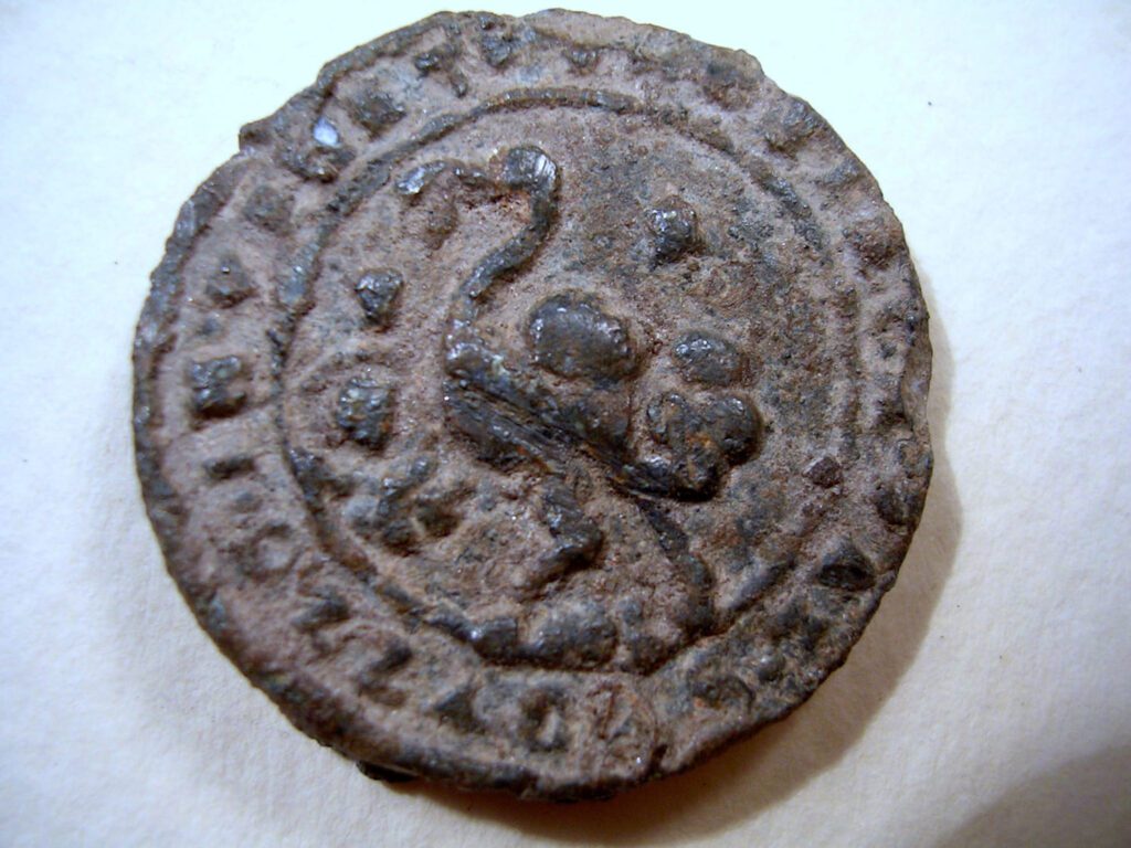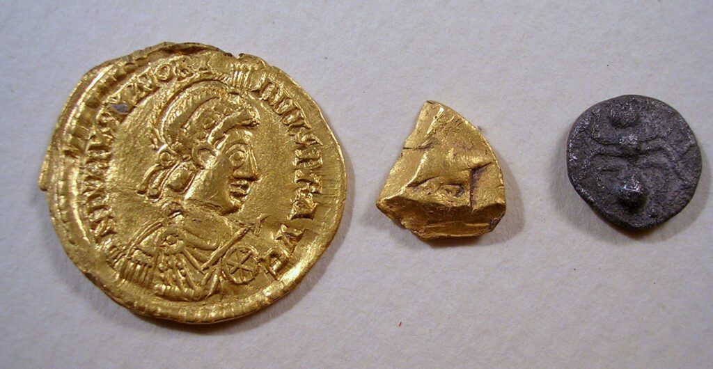 Maiorianus császár6 (késő császárkor, Kr. e. 457–461) pénz), feltehetően kelta pénztöredék), hangya-motívumos boius (kelta) kisezüst, mindhárom az Angyali-földekről