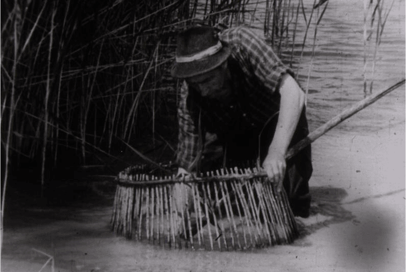 Tapogatóval való halászat a Fertőn. A képen Heiner József. A Heiner család régi halászfamília Sarródon.