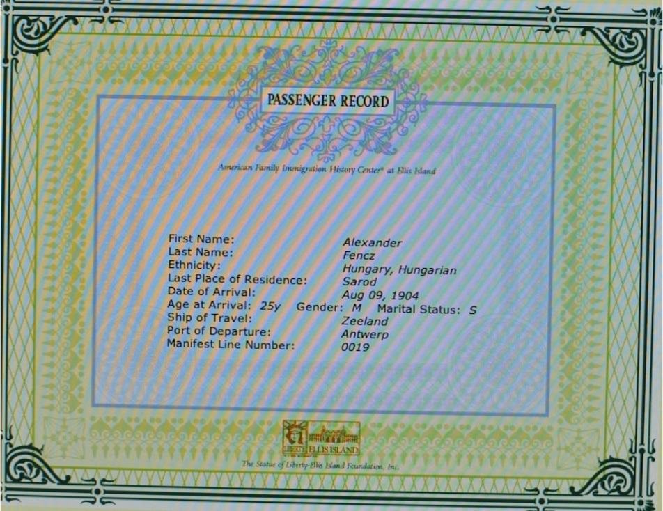 Fencz Sándor adatai az amerikai nyilvántartásból. 25 évesen Antwerpenben szállt hajóra, és 1904. augusztus 4.én ért Amerikába