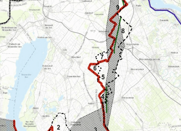 Keresztcsíkozott terület: az 1921-23-as semleges zóna; szaggatott vonal: osztrák határbizottsági javaslat; pontozott vonal: a közigazgatási és a végleges (piros) határ nem esik egybe. Számokkal jelölt helyek: 1: Mexikópuszta; 2: Pomogy (Pamhagen; községhatárával jelezve); 3: Hansági birtokrészek; 4: Lehndorf (Röhrerhof); 5: Haidstatt (a másik cikkben: Jesse-major, ma Várbalog), Új-Saida-major; Haidhof; 6: Albertkázmérpuszta; 7: Kleinhof, Wittmannshof; 8. Márialiget (Marienhof); 9: Károly-major; 10: Laura-major; 11: Ürgéd-puszta; 12: Fácánkert. A korábbi kataszteri településhatároktól – a Hanság-főcsatornát leszámítva – az 1, 4, 6, 7, 11 és 12. számú esetekben történt eltérés. https://trianon100.hu/blog-cikk/hatarmegallapitas-a-mosoni-sikon-