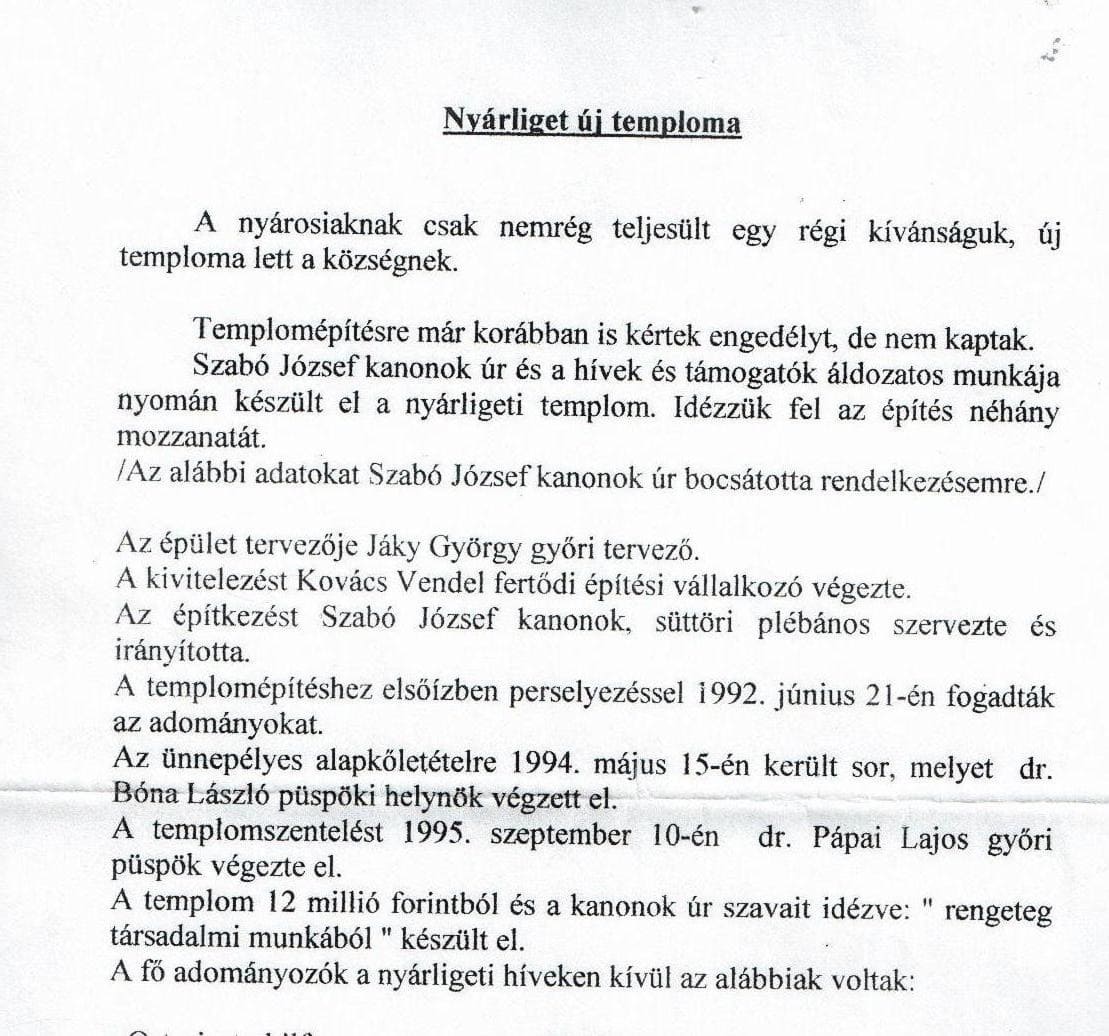 „Az épületben kevés átalakítással egy 10×5 méteres tantermet és kétszobás pedagóguslakást hoztunk létre. A tanterem minden bútorzatát /pad, asztal, szék/ szintén a helyi lakosság és a mesteremberek társadalmi munkájának köszönhette. Ebben az időben Sarród községben tanítottam feleségemmel együtt. A nyárasmajoriak kérésére és a Tankerületi Főigazgatóság kinevezésére elfogadtam az új iskola vezetését, mint két tanerős állami elemi iskolát. Egy év múltán római katolikus egyházi iskola lett az államosításig. Az iskola 1945. november 26-án kezdte meg első tanítási napját 66 tanulóval és 8 osztállyal I–IV. és V–VIII. csoportosításban. Az iskola körzetéhez tartozott ekkor és egészen a körzetesítésig a településtől kb. másfél km-re fekvő Feketebokor és Kisház major tanulóifjúsága is.”