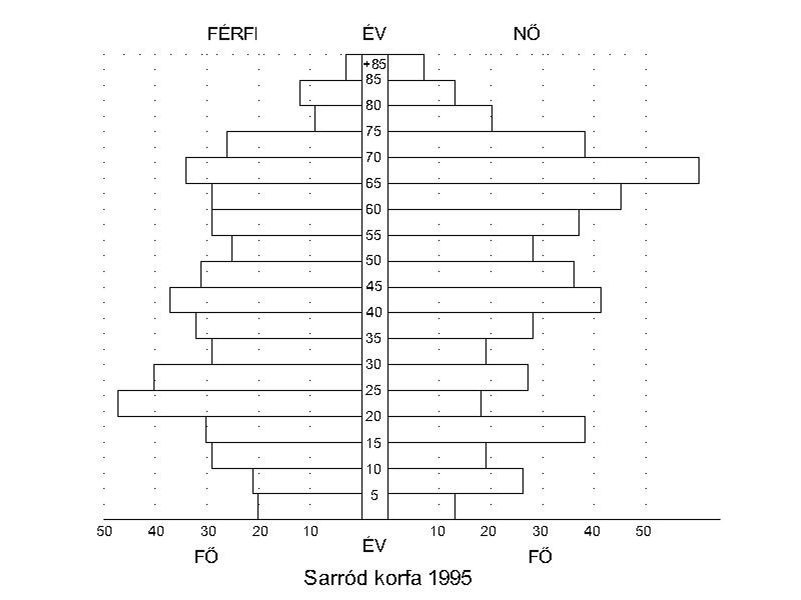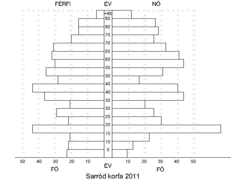 Sarród koreloszlása az országos eloszlással összhangban a fogyó népesség hagyma alakú korfáját formázza, a kis mintának köszönhető egy-egy kirívó adattal. Ezektől eltekintve kijelenthető, hogy Sarród népessége az országos átlaghoz képest öregebb koreloszlást mutat, de ugyanez érvényes a megyei hasonló méretű településekre is. A Ratkó-korszak következményeit megfigyelhetjük a korfákon, tehát az 1950–56 között születettek számosabbak, az ismétlődés látható, ám kevésbé súlyos a leszármazottakat tekintve, mint annak lennie kellene az országos adatok alapján. Ebből is arra következtetünk, hogy az újabb generáció már más helyen kereste a boldogulást. A 15–20 év közöttiek kiugró hányadát egyrészről egy ismétlődés okozza a korfában, ők részben a Ratkó-korszak 3. generációja, másrészről a Sarródra betelepülő, főleg fiatalabb, gyermekes családoknak köszönhető.