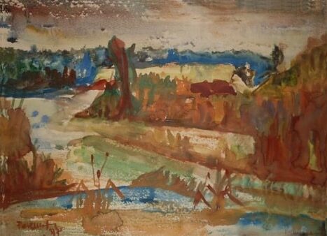 Ha kelet felé fordulunk, a Hanság (1975) című alkotását nézve láthatjuk, hogy ritmusai, a dűlők és fasorok, nyugat felé irányulnak. A különös tektonikával megfestett kép mozgalmas ecsetkezelését és a vegetációk kulisszás elrendezését követve, a barna – kék – zöld – kék – ibolya harmóniájában igazi hanyi atmoszférát idéznek elő. Az ősz teljességét és egységét, a mezősávok és égeres-nyárfás fasorok dinamikájában, a távoli Hany kéksége zárja le, az égi lilás felhők függönyével. A mezősávok üressége a Pannon-dombok hullámzásában megadják a táj szerkezetét. Ez az akvarell az egész táj karakterisztikumát megadó műalkotás.