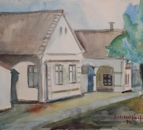 Sarród, „Fő utca régen” (1987) A három – három szembenéző vedutás házsort az alkotó az elszürkült cserepes házak futamában, felfelé átlós irányban széles járdával összekapcsolódva mutatja be. A népi fűrészfogas elrendezésű, nemcsak a tájra jellemző